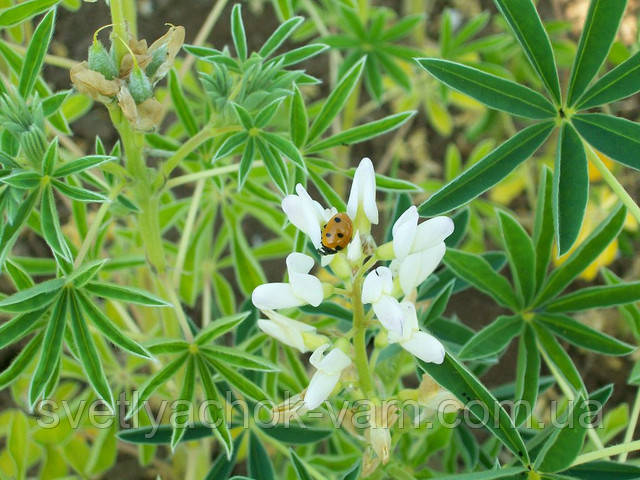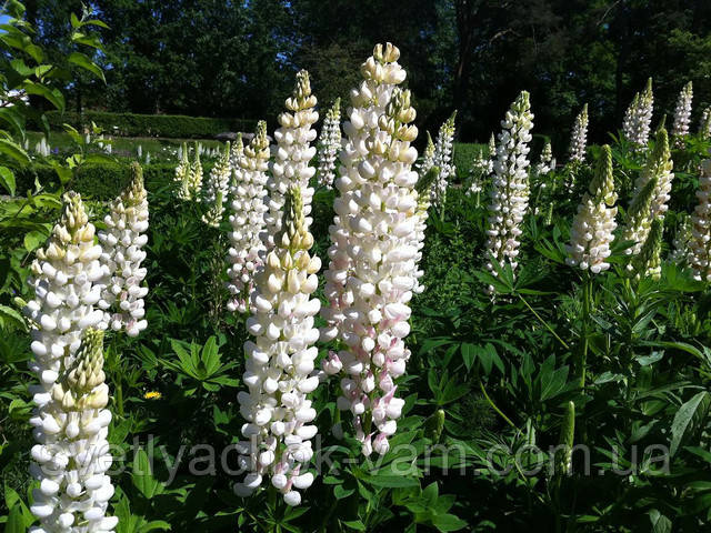 Люпин білий. Рослина утворює великий чагарник висотою до 1,5 м. Його від основи розгалужені пагони покриває смарагдова пальчаста листя. По її краях густо ростуть сріблясті вії. Сегменти зігнуті уздовж центральної жилки. Білі квіти з легким рожевим або блакитним відтінком ростуть в довгих суцвіттях, розташовуючись по спіралі.