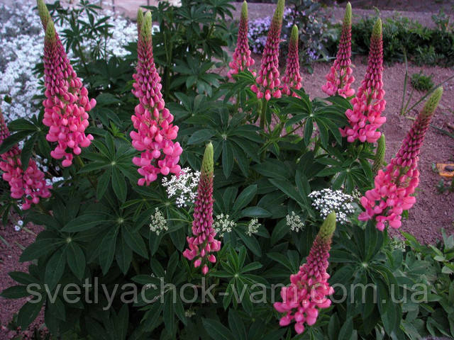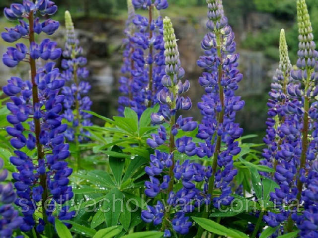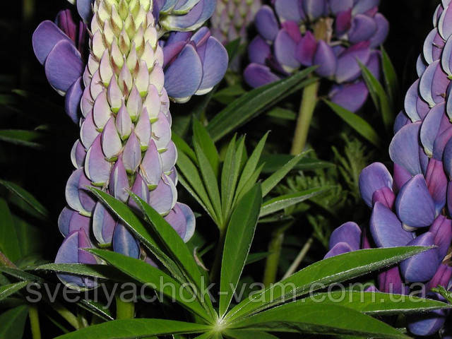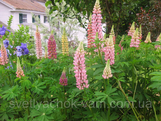 Люпин багатолистний. Цей багаторічник живе в Північній Америці. Він стійкий до морозів і добре росте в помірному кліматі. Висота прямих, майже позбавлених листя, стебел становить 0,8-1,2 м. Від землі піднімаються великі пальчасті листки на довгих черешках. Знизу яскраво-зелена листова пластина покрита ворсом. Суцвіття довжиною 30-35 см розпускається в червні і складається з синьо-фіолетових дрібних кольорів без запаху.