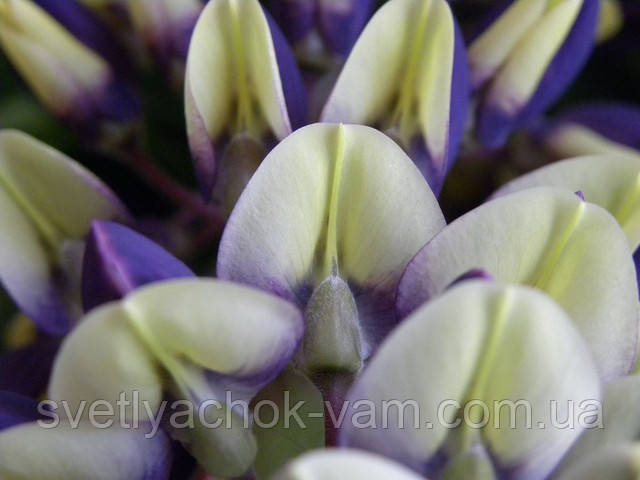 Верхівку стебла прикрашає довга кисть, покрита колотівками мотыльковых квітів на коротких квітконіжках. Віночок у вигляді вітрила має білу, блакитну, фіолетове, рожеве забарвлення. Також на одній рослині можуть розташовуватися суцвіття з різним відтінком пелюсток. У човнику з нижніх пелюсток ховаються 10 тичинок, їх нитки на підставі зростаються. Поблизу знаходиться зав'язь сидяча з головчатым приймочкою.