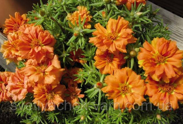 Стебло сильноразветвленний. Забарвлення пелюсток – помаранчева. Цвітіння відбувається з липня по жовтень. У висоту портулак цього сорту досягає 12 сантиметрів. Можна розташувати його між плитами садових доріжок або використовувати як ампельна рослина.